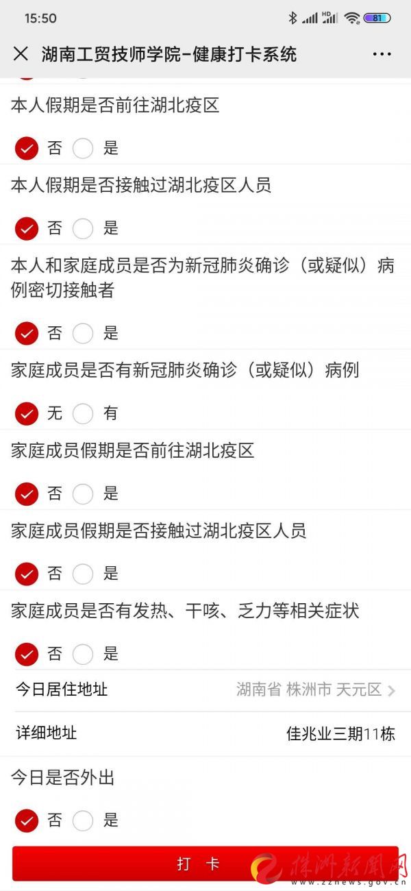 株洲新闻网3月4日讯(记者 文樱 通讯员 韩超平)为了对学校教职员工和学生进行全覆盖排查,实行“日报告、零报告”,掌握全校师生员工的健康情况,日前,开云网页版页面登录创新防疫工作机制,在开云网页版页面登录微信公众号开设了“防疫登记”专栏,专门用于全体教职工和学生疫情防控期间的健康监测,扎实精准推进疫情防控工作。