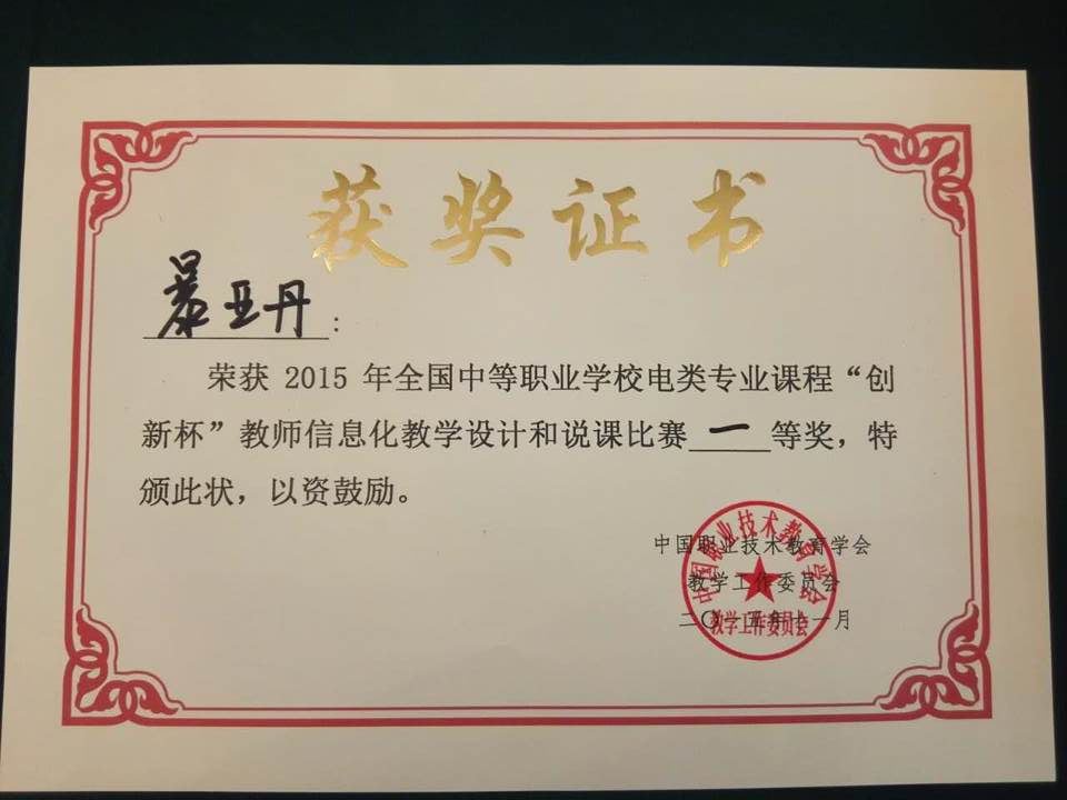 祝贺我系暴亚丹老师荣获全国中等职业学校电类专业课程“创新杯”教师信息化教学设计和说课比赛一等奖。
