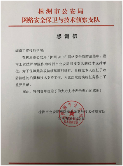 针对此次“护网2018”网络安全攻防演练,株洲市公安局网络安全保卫与技术侦查支队对我院师生的网络安全防范意识高度赞扬,同时,参与本次攻防演练也是对我院网络安全防范的一次成功宣传和预演。(教务处 供稿)