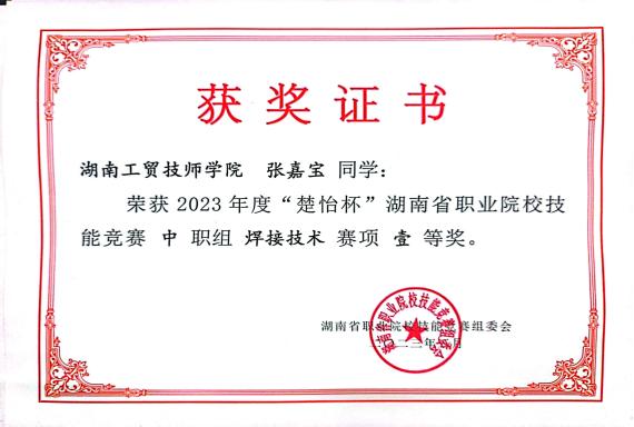3月3日,2023年度“楚怡杯”湖南省职业院校技能竞赛焊接技术赛项圆满落下帷幕。经过紧张激烈的技能比拼及赛后专家的评审,易文斌,杨文武指导的焊接专业学生张嘉宝、李世杰同学荣获焊接技术赛项中职组一等奖。