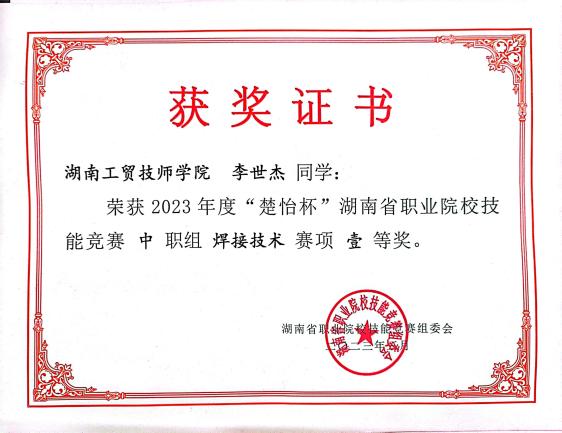 本赛项由湖南省教育厅、湘潭市人民政府主办,来自全省各地的选手同台比武。中职组焊接技术赛项以个人赛方式进行,分三个模块进行,重点考察选手按图纸要求进行试件打磨、装配和焊接的技术能力,同时考核选手的操作规范性和安全文明生产等。张嘉宝和李世杰两位选手凭借扎实的专业知识及高超的技能水平,均荣获该赛项一等奖。