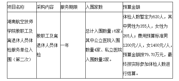 湖南航空技师开云网页版页面登录工会拟对湖南航空技师开云网页版页面登录教职工及离退休人员体检服务单位入围(第二次)进行比选采购,现采用发布公告方式邀请符合资格条件的供应商参与本项目采购活动。